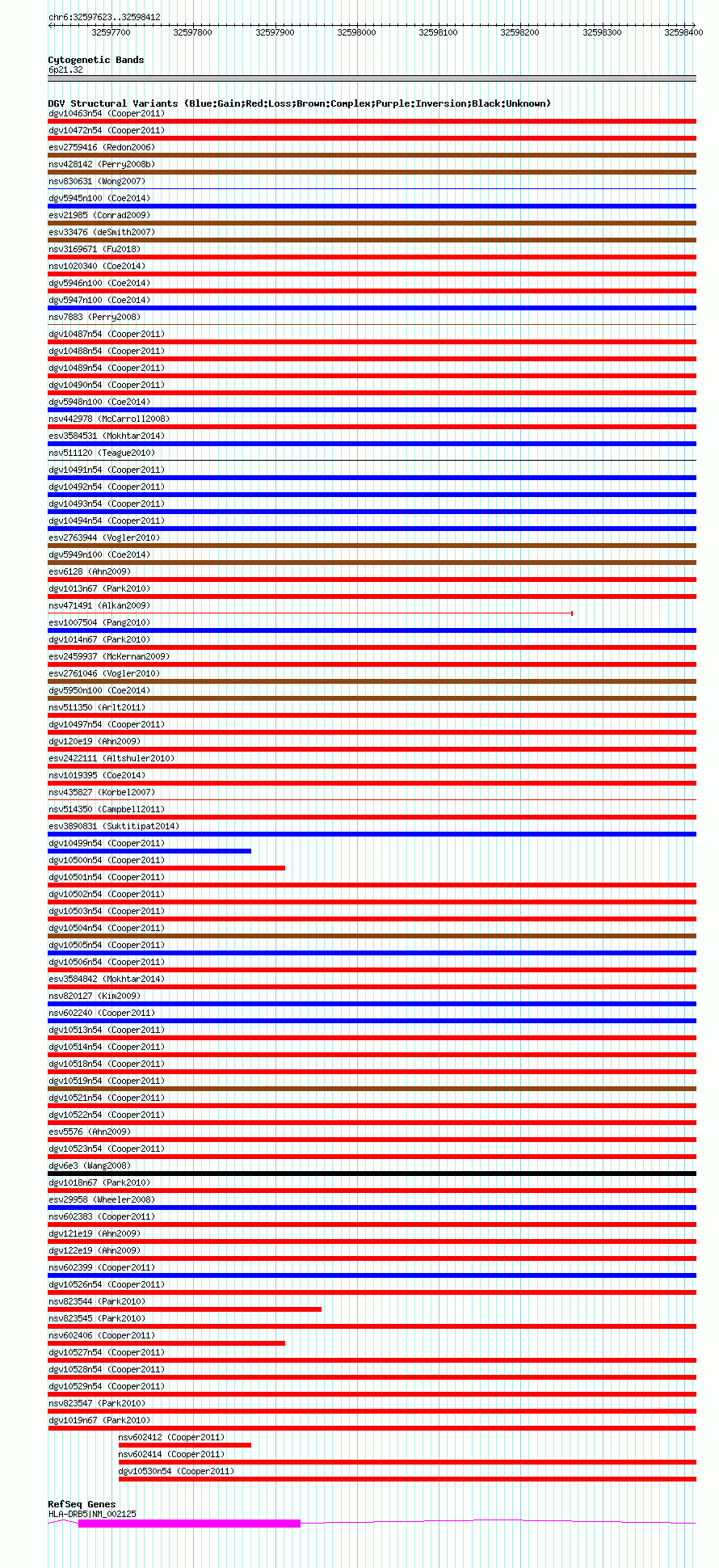 Variant DetailsVariant: dgv1019n67 | Internal ID | 22782002 | | Landmark | | | Location Information | | | Cytoband | 6p21.32 | | Allele length | | Assembly | Allele length | | hg38 | 790 | | hg19 | 790 | | hg18 | 790 |