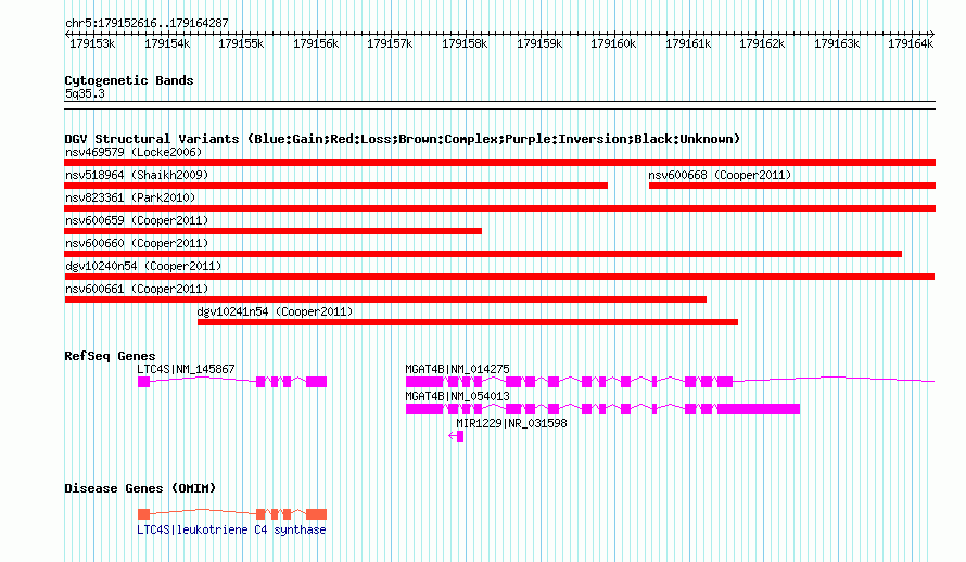 Variant DetailsVariant: dgv10240n54| Internal ID | 20143664 | | Landmark | | | Location Information | | | Cytoband | 5q35.3 | | Allele length | | Assembly | Allele length | | hg38 | 11673 | | hg19 | 11672 | | hg18 | 11672 |