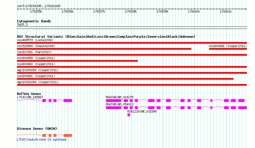 Variant DetailsVariant: dgv10241n54| Internal ID | 20143665 | | Landmark | | | Location Information | | | Cytoband | 5q35.3 | | Allele length | | Assembly | Allele length | | hg38 | 7252 | | hg19 | 7251 | | hg18 | 7251 |