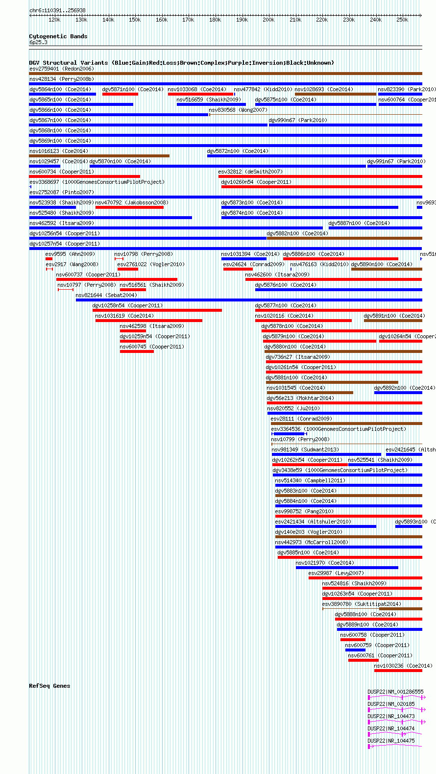 | Variant Type | CNV gain | Copy Number | | Allele State | | Allele Origin | | Probe Count | | Validation Flag | | Merged Status | M | Merged Variants | | Supporting Variants | nsv600740, nsv600736 | Samples | NINDS_15 | Known Genes | DUSP22 | Method | SNP array | Analysis | Illumina SNP array copy number analysis | Platform | Not reported | Comments | | Reference | Cooper_et_al_2011 | Pubmed ID | 21841781 | Accession Number(s) | dgv10257n54