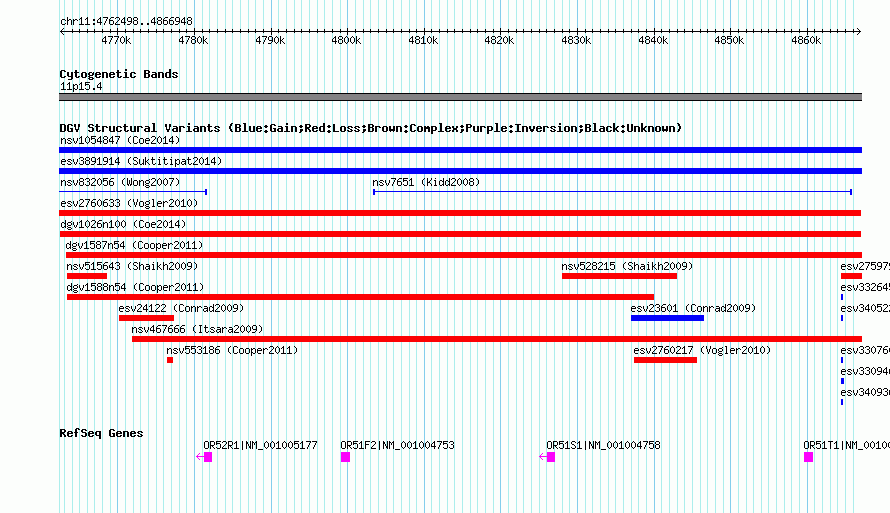 Variant DetailsVariant: dgv1026n100| Internal ID | 22787113 | | Landmark | | | Location Information | | | Cytoband | 11p15.4 | | Allele length | | Assembly | Allele length | | hg38 | 104451 | | hg19 | 104451 | | hg18 | 104451 |