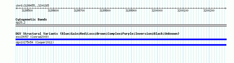 Variant DetailsVariant: dgv10275n54| Internal ID | 20143699 | | Landmark | | | Location Information | | | Cytoband | 6p25.2 | | Allele length | | Assembly | Allele length | | hg38 | 811 | | hg19 | 811 | | hg18 | 811 |