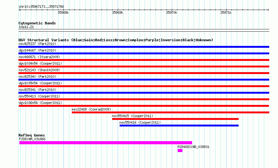 | | Variant Type | CNV loss | | Copy Number | | | Allele State | | | Allele Origin | | | Probe Count | | | Validation Flag | | | Merged Status | M | | Merged Variants | | | Supporting Variants | nsv550410, nsv550412, nsv550414, nsv550411 | | Samples | | | Known Genes | FZD8, MIR4683 | | Method | SNP array | | Analysis | Illumina SNP array copy number analysis | | Platform | Not reported | | Comments | | | Reference | Cooper_et_al_2011 | | Pubmed ID | 21841781 | | Accession Number(s) | dgv1036n54