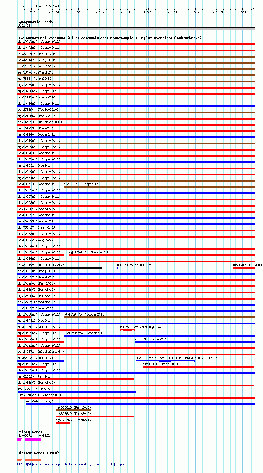 Variant DetailsVariant: dgv1036n67 | Internal ID | 22782019 | | Landmark | | | Location Information | | | Cytoband | 6p21.32 | | Allele length | | Assembly | Allele length | | hg38 | 10089 | | hg19 | 10089 | | hg18 | 10089 |