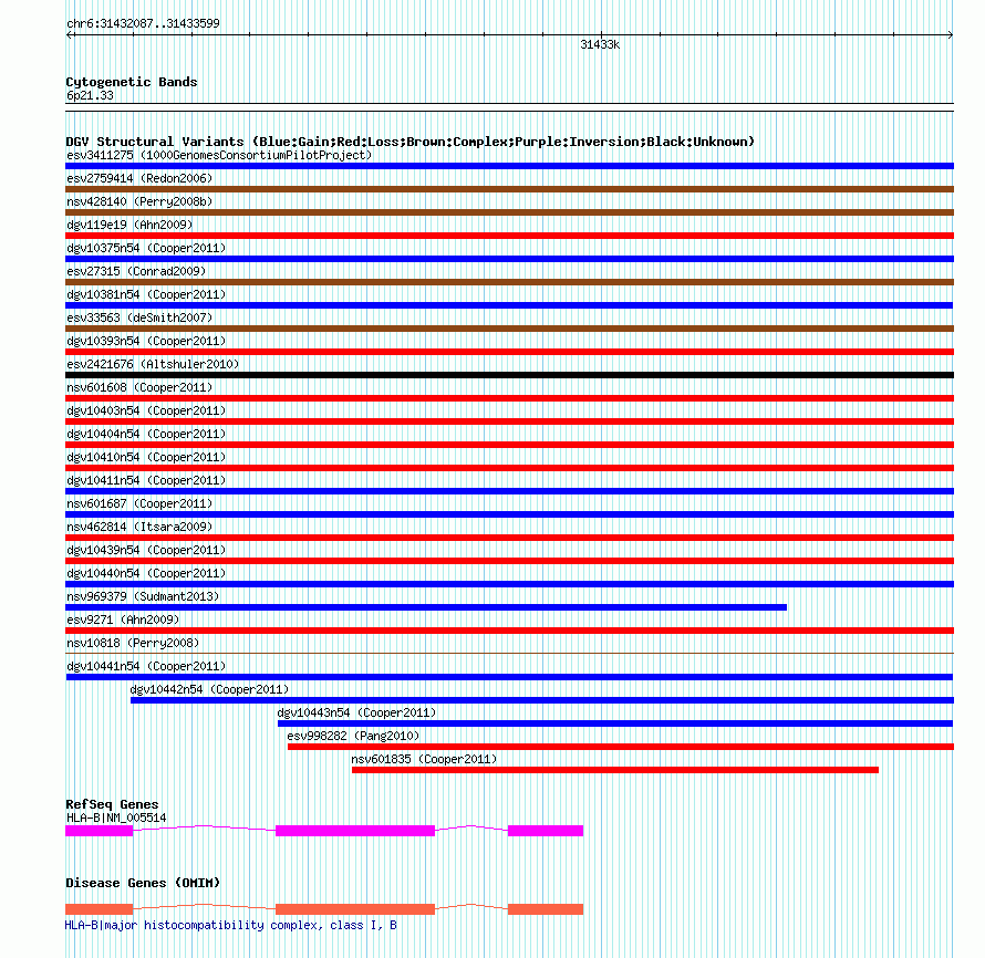 Variant DetailsVariant: dgv10441n54| Internal ID | 22778336 | | Landmark | | | Location Information | | | Cytoband | 6p21.33 | | Allele length | | Assembly | Allele length | | hg38 | 1513 | | hg19 | 1513 | | hg18 | 1513 |