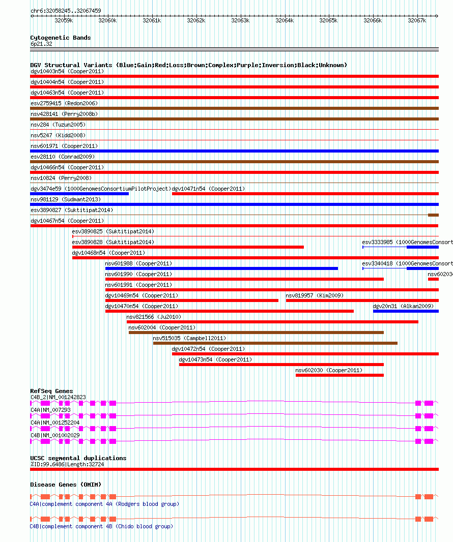 | | Variant Type | CNV loss | | Copy Number | | | Allele State | | | Allele Origin | | | Probe Count | | | Validation Flag | | | Merged Status | M | | Merged Variants | | | Supporting Variants | nsv601979, nsv601978 | | Samples | | | Known Genes | C4A, C4B, C4B_2 | | Method | SNP array | | Analysis | Illumina SNP array copy number analysis | | Platform | Not reported | | Comments | | | Reference | Cooper_et_al_2011 | | Pubmed ID | 21841781 | | Accession Number(s) | dgv10467n54