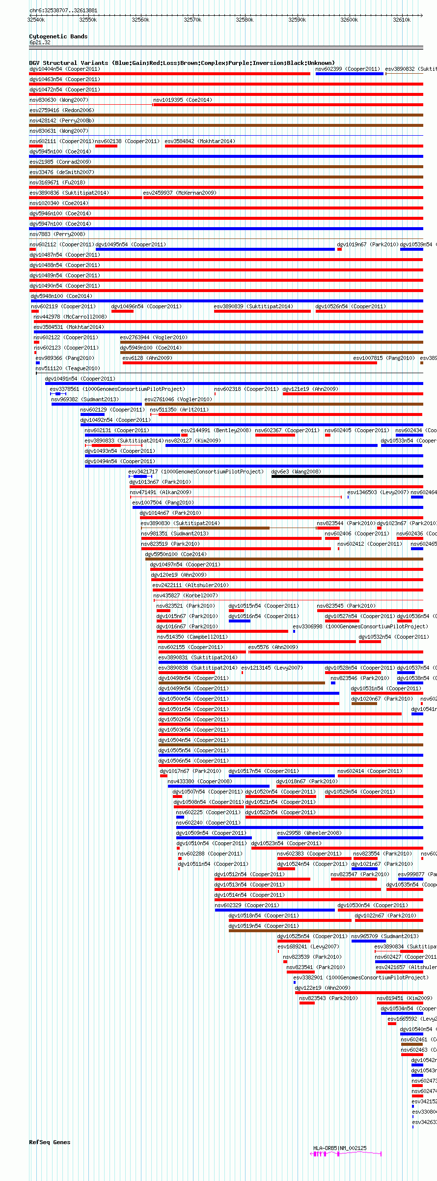 Variant DetailsVariant: dgv10487n54| Internal ID | 22778382 | | Landmark | | | Location Information | | | Cytoband | 6p21.32 | | Allele length | | Assembly | Allele length | | hg38 | 75175 | | hg19 | 75175 | | hg18 | 75175 |