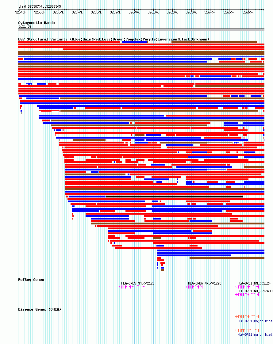 Variant DetailsVariant: dgv10488n54| Internal ID | 22778383 | | Landmark | | | Location Information | | | Cytoband | 6p21.32 | | Allele length | | Assembly | Allele length | | hg38 | 129599 | | hg19 | 129599 | | hg18 | 129599 |