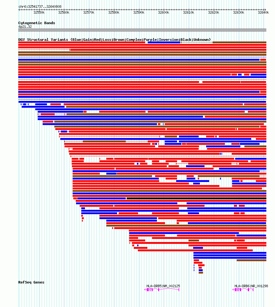 Variant DetailsVariant: dgv10491n54| Internal ID | 22778386 | | Landmark | | | Location Information | | | Cytoband | 6p21.32 | | Allele length | | Assembly | Allele length | | hg38 | 99072 | | hg19 | 99072 | | hg18 | 99072 |
