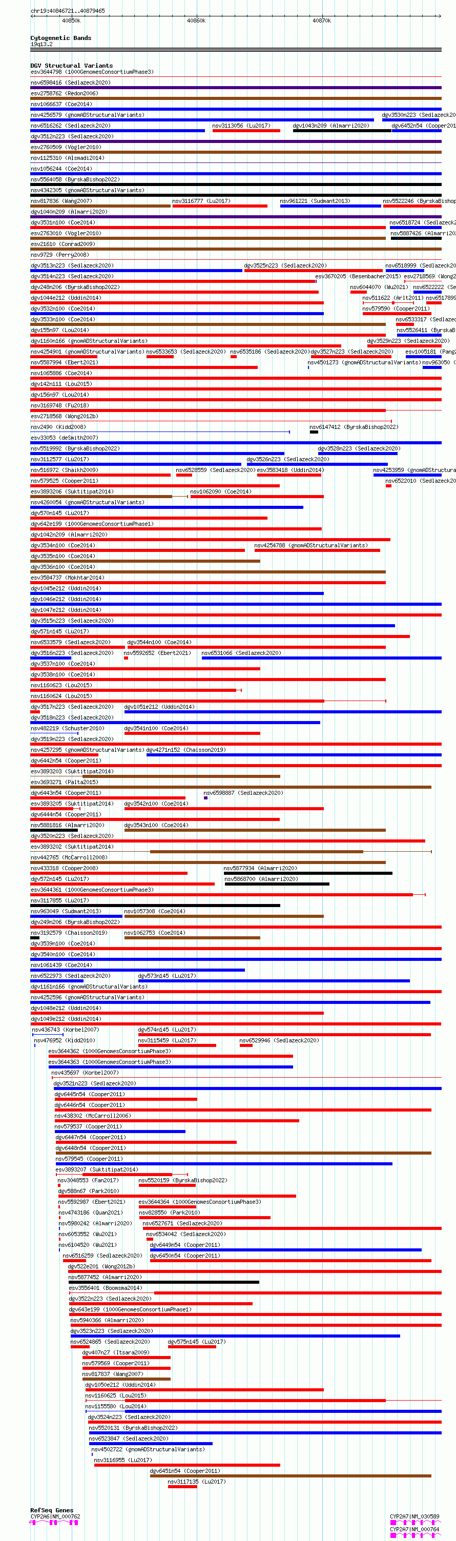 Variant DetailsVariant: dgv1049e212 | Internal ID | 22783976 | | Landmark | | | Location Information | | | Cytoband | 19q13.2 | | Allele length | | Assembly | Allele length | | hg38 | 32745 | | hg19 | 32745 |