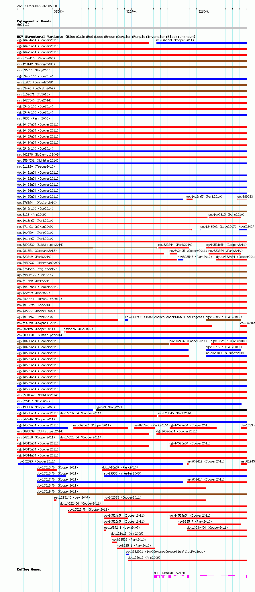 Variant DetailsVariant: dgv10513n54| Internal ID | 22778408 | | Landmark | | | Location Information | | | Cytoband | 6p21.32 | | Allele length | | Assembly | Allele length | | hg38 | 31802 | | hg19 | 31802 | | hg18 | 31802 |