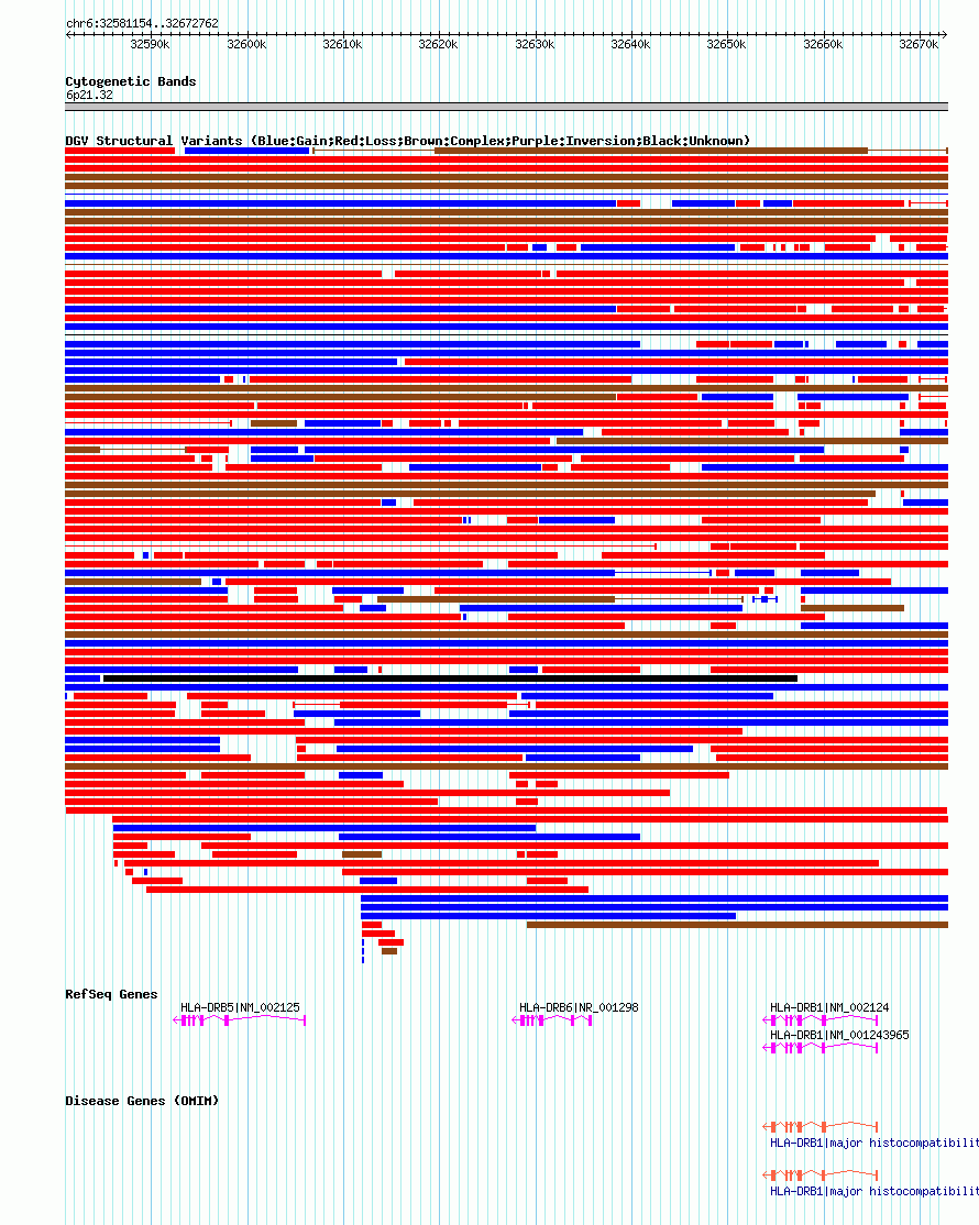 Variant DetailsVariant: dgv10523n54| Internal ID | 22778418 | | Landmark | | | Location Information | | | Cytoband | 6p21.32 | | Allele length | | Assembly | Allele length | | hg38 | 91609 | | hg19 | 91609 | | hg18 | 91609 |