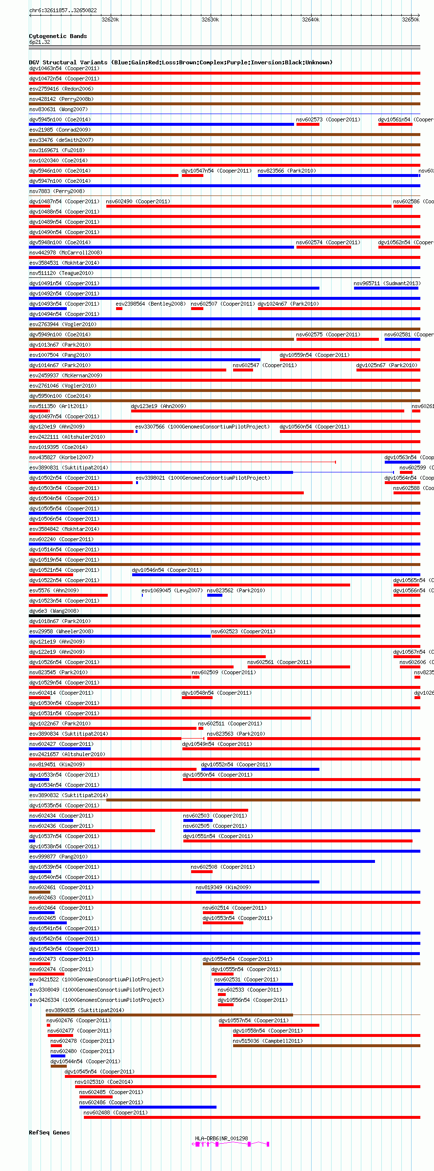Variant DetailsVariant: dgv10543n54| Internal ID | 22778438 | | Landmark | | | Location Information | | | Cytoband | 6p21.32 | | Allele length | | Assembly | Allele length | | hg38 | 38966 | | hg19 | 38966 | | hg18 | 38966 |