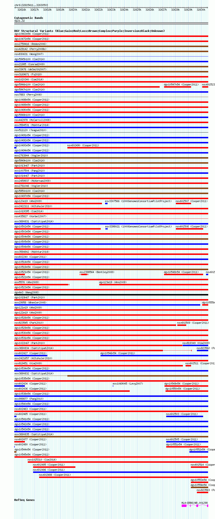 Variant DetailsVariant: dgv10545n54| Internal ID | 22778440 | | Landmark | | | Location Information | | | Cytoband | 6p21.32 | | Allele length | | Assembly | Allele length | | hg38 | 15093 | | hg19 | 15093 | | hg18 | 15093 |