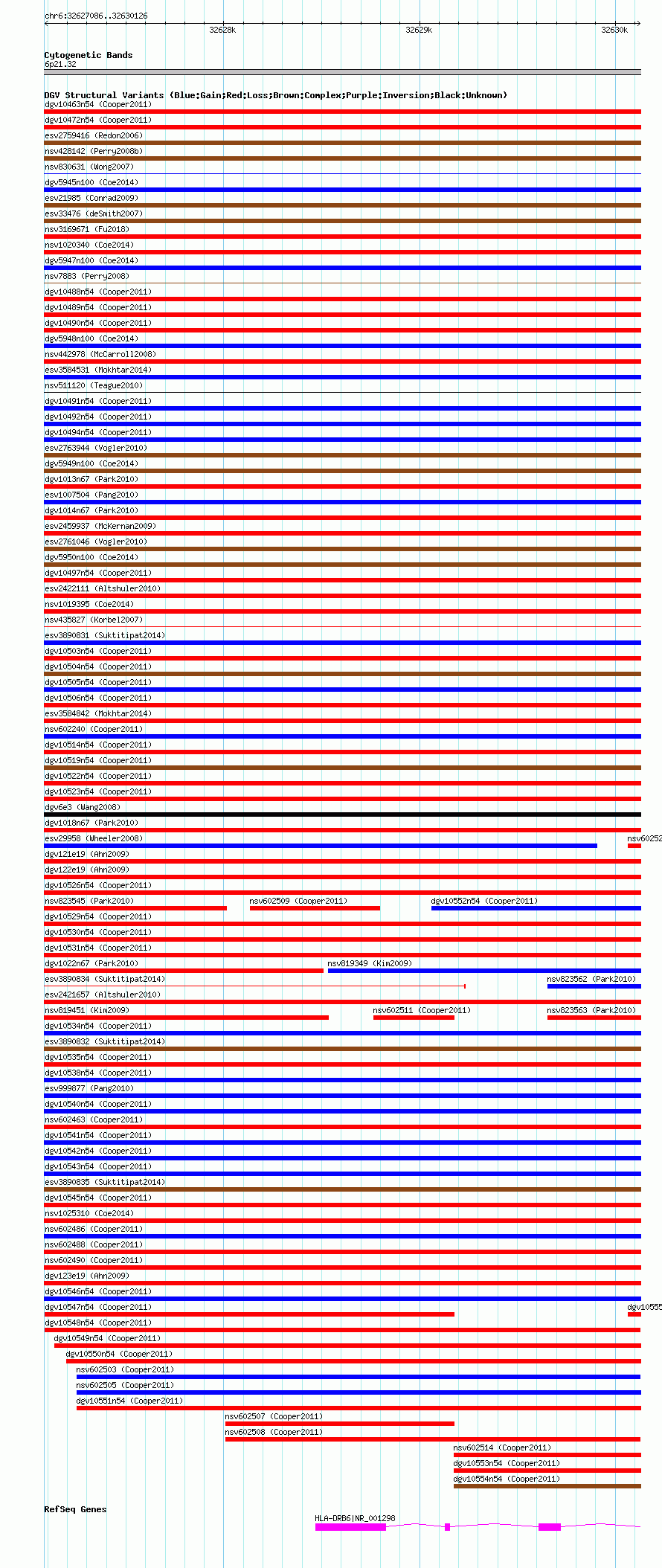 Variant DetailsVariant: dgv10548n54| Internal ID | 22778443 | | Landmark | | | Location Information | | | Cytoband | 6p21.32 | | Allele length | | Assembly | Allele length | | hg38 | 3041 | | hg19 | 3041 | | hg18 | 3041 |