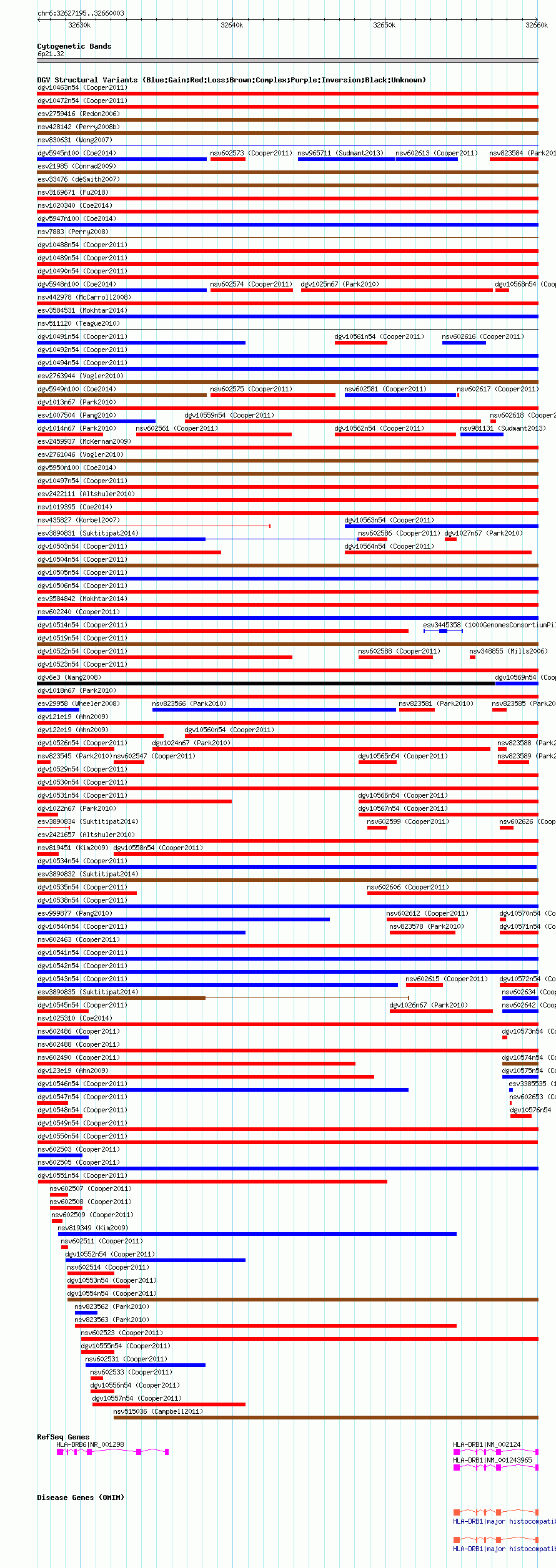 Variant DetailsVariant: dgv10550n54| Internal ID | 22778445 | | Landmark | | | Location Information | | | Cytoband | 6p21.32 | | Allele length | | Assembly | Allele length | | hg38 | 32809 | | hg19 | 32809 | | hg18 | 32809 |