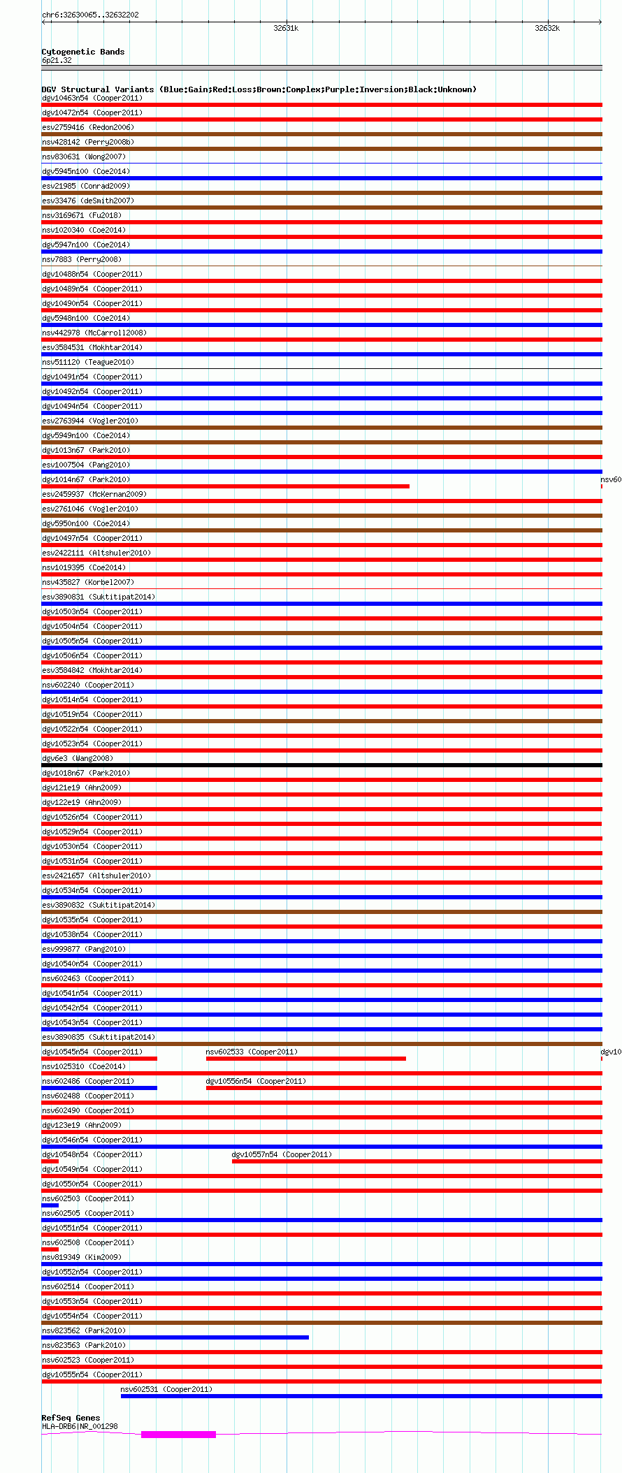 Variant DetailsVariant: dgv10555n54| Internal ID | 22778450 | | Landmark | | | Location Information | | | Cytoband | 6p21.32 | | Allele length | | Assembly | Allele length | | hg38 | 2138 | | hg19 | 2138 | | hg18 | 2138 |