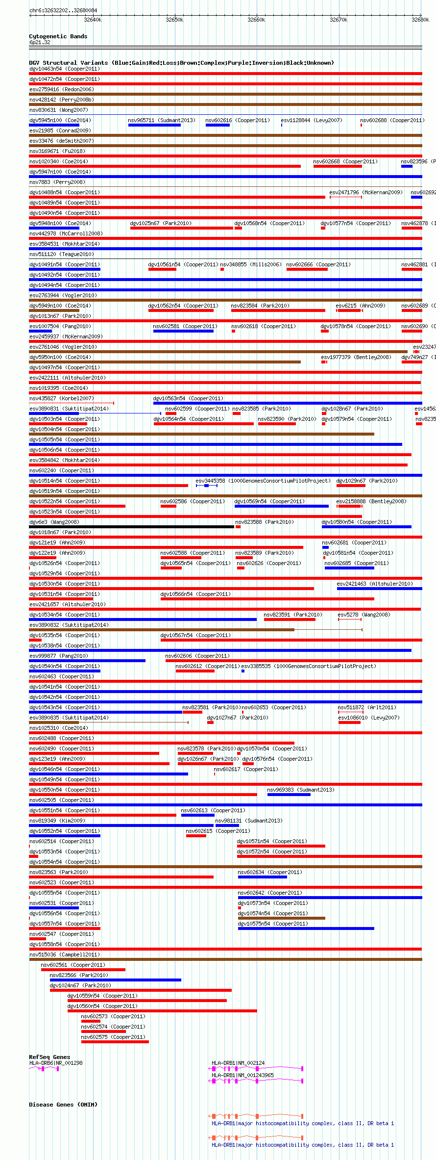 Variant DetailsVariant: dgv10558n54| Internal ID | 22778453 | | Landmark | | | Location Information | | | Cytoband | 6p21.32 | | Allele length | | Assembly | Allele length | | hg38 | 47883 | | hg19 | 47883 | | hg18 | 47883 |