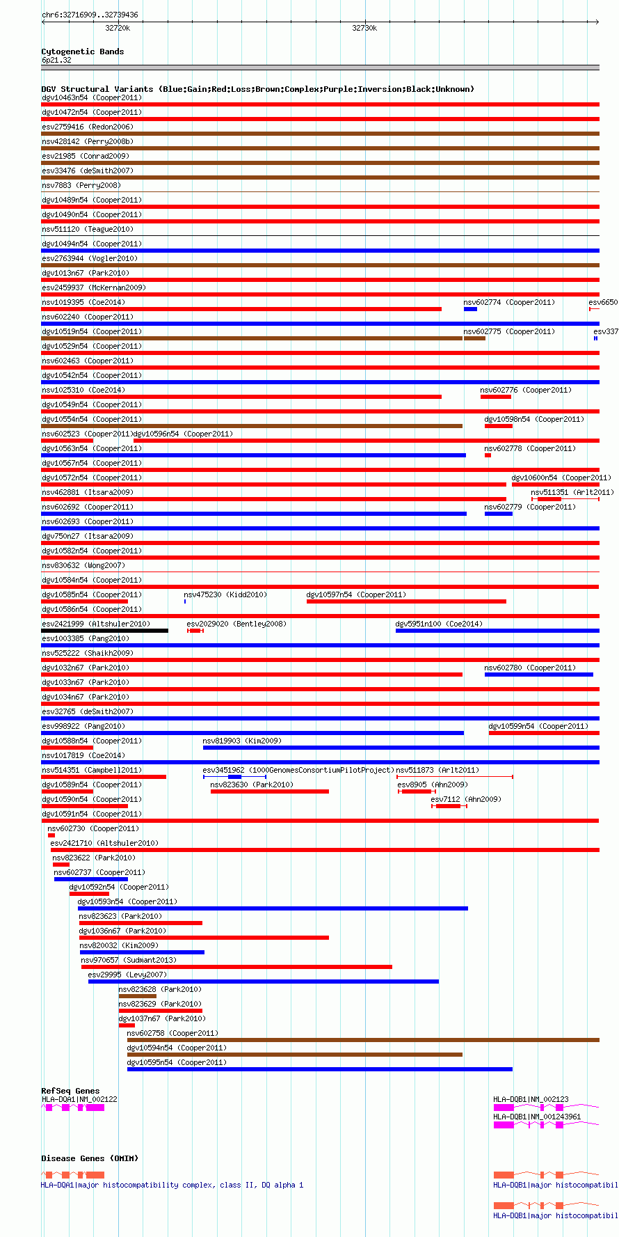 Variant DetailsVariant: dgv10591n54| Internal ID | 22778486 | | Landmark | | | Location Information | | | Cytoband | 6p21.32 | | Allele length | | Assembly | Allele length | | hg38 | 22528 | | hg19 | 22528 | | hg18 | 22528 |