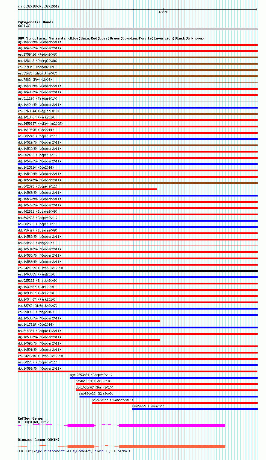 Variant DetailsVariant: dgv10592n54| Internal ID | 22778487 | | Landmark | | | Location Information | | | Cytoband | 6p21.32 | | Allele length | | Assembly | Allele length | | hg38 | 1583 | | hg19 | 1583 | | hg18 | 1583 |