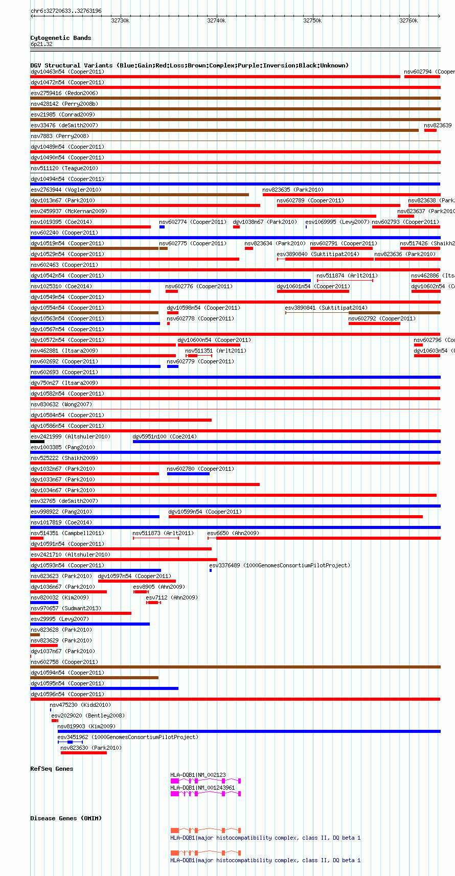 Variant DetailsVariant: dgv10596n54| Internal ID | 22778491 | | Landmark | | | Location Information | | | Cytoband | 6p21.32 | | Allele length | | Assembly | Allele length | | hg38 | 42564 | | hg19 | 42564 | | hg18 | 42564 |