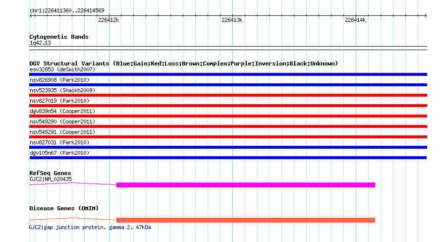 | Variant Type | CNV gain | Copy Number | | Allele State | | Allele Origin | | Probe Count | | Validation Flag | | Merged Status | M | Merged Variants | | Supporting Variants | nsv827042, nsv827053 | Samples | NA18526, NA18972 | Known Genes | GJC2 | Method | Oligo aCGH | Analysis | To select parameters for calling CNVs (that is, the statistical threshold of the ADM2 algorithm, the minimum +/- log2 ratio and the minimum number of consecutive probes in a CNV interval), we calculated the sensitivity and positive predictive value based on the comparison of aCGH-based CNV calls (using our high-resolution Agilent 24M platform) with read-depth sequence data for two samples from Korean individuals (AK1 and AK2). We attempted to obtain `absolute' copy number status of the sample from NA10851, which was used as the reference sample for aCGH experiments in this study. For this, we used read-depth data for NA10851 obtained from massively parallel sequencing by the Illumina GA II data. The read-depth data represent the copy number status of NA10851 as compared to the human reference genome (hg18) because the short read sequences were aligned to hg18. | Platform | Agilent 24M aCGH | Comments | | Reference | Park_et_al_2010 | Pubmed ID | 20364138 | Accession Number(s) | dgv105n67