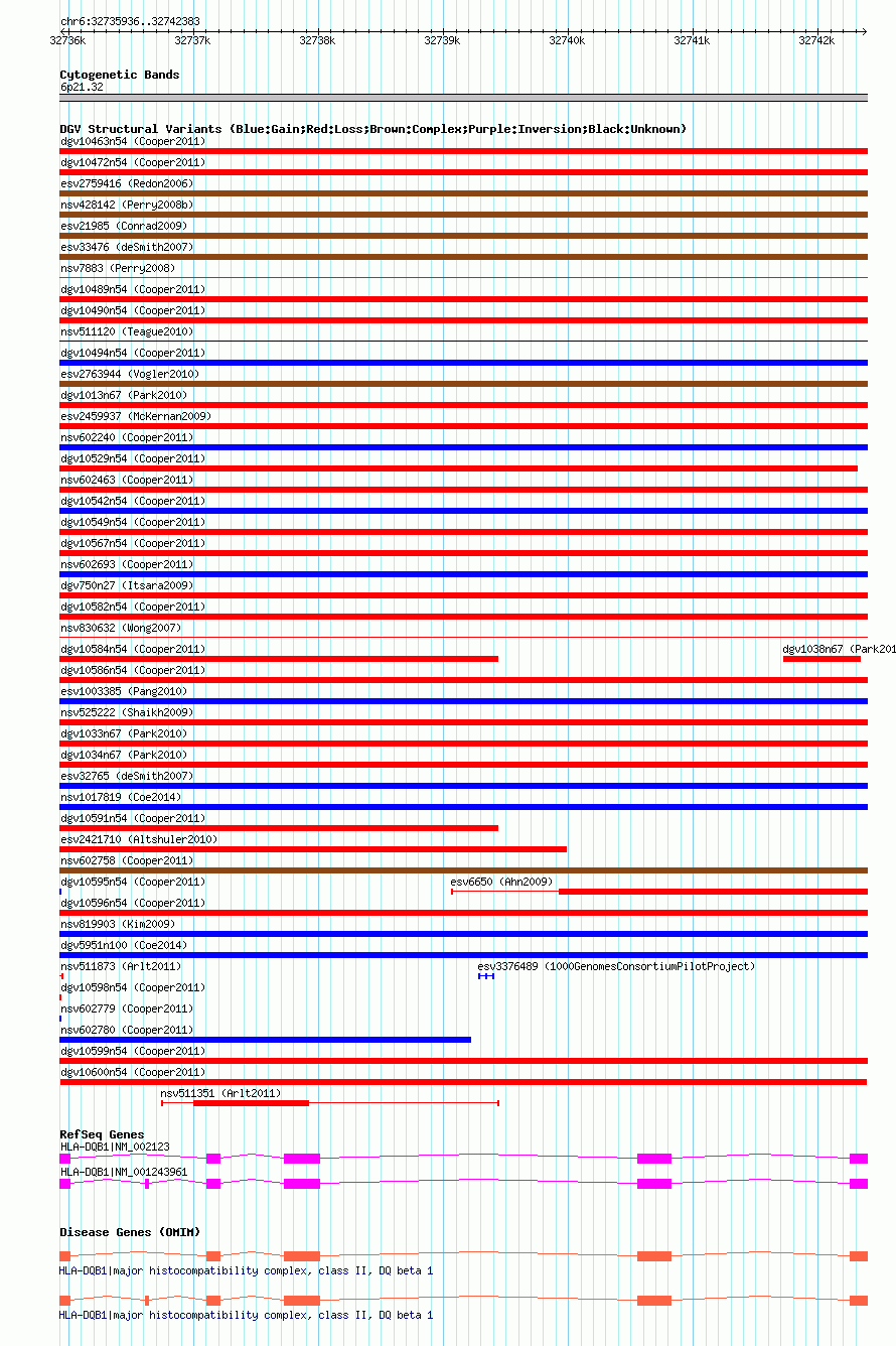 Variant DetailsVariant: dgv10600n54| Internal ID | 22778495 | | Landmark | | | Location Information | | | Cytoband | 6p21.32 | | Allele length | | Assembly | Allele length | | hg38 | 6448 | | hg19 | 6448 | | hg18 | 6448 |