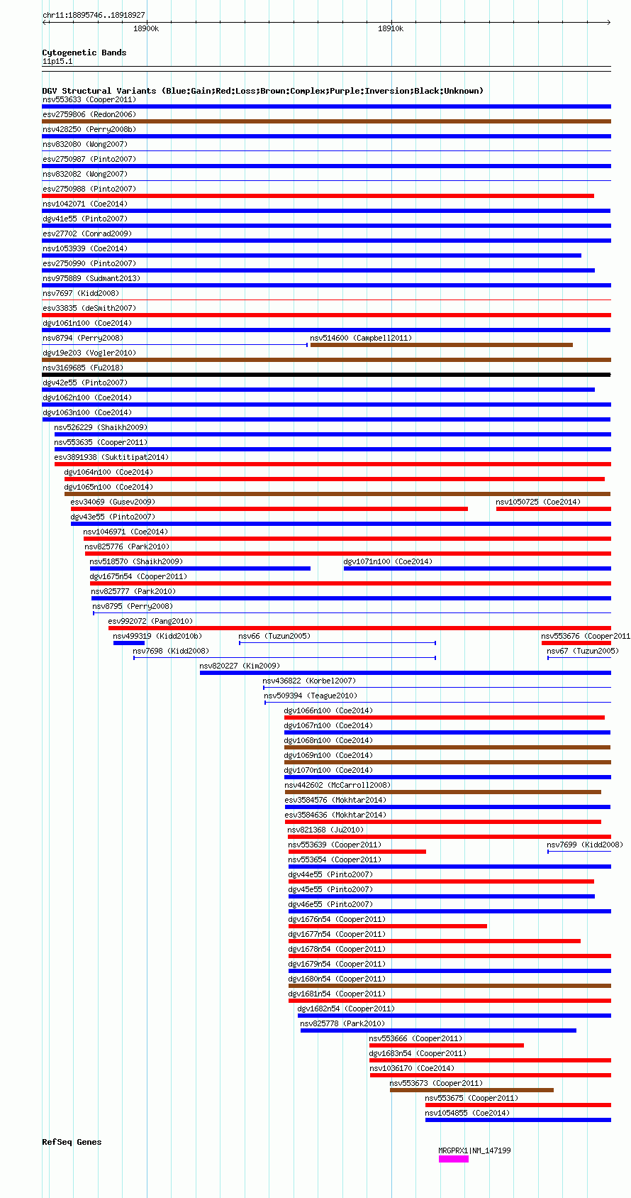 Variant DetailsVariant: dgv1063n100| Internal ID | 22787150 | | Landmark | | | Location Information | | | Cytoband | 11p15.1 | | Allele length | | Assembly | Allele length | | hg38 | 23182 | | hg19 | 23182 | | hg18 | 23182 |