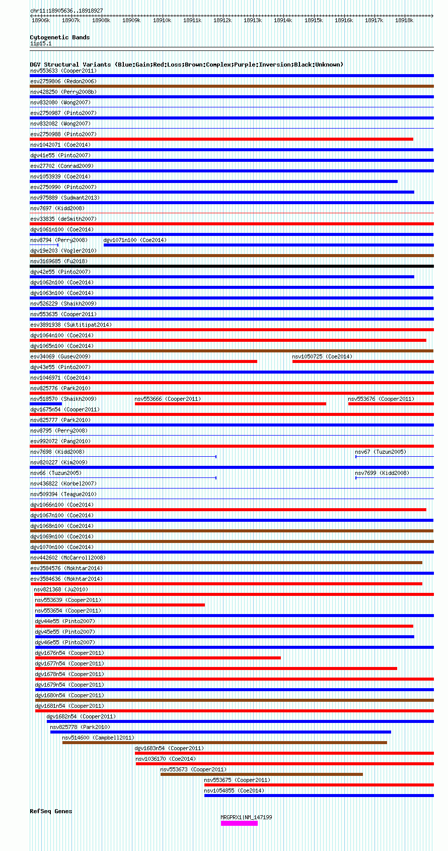 Variant DetailsVariant: dgv1067n100| Internal ID | 22787154 | | Landmark | | | Location Information | | | Cytoband | 11p15.1 | | Allele length | | Assembly | Allele length | | hg38 | 13292 | | hg19 | 13292 | | hg18 | 13292 |