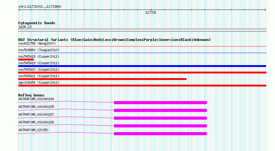 Variant DetailsVariant: dgv108n54| Internal ID | 22768003 | | Landmark | | | Location Information | | | Cytoband | 1p36.22 | | Allele length | | Assembly | Allele length | | hg38 | 1859 | | hg19 | 1859 | | hg18 | 1859 |