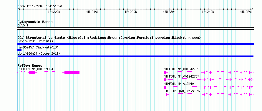 | | Variant Type | CNV gain | | Copy Number | | | Allele State | | | Allele Origin | | | Probe Count | | | Validation Flag | | | Merged Status | M | | Merged Variants | | | Supporting Variants | nsv604853, nsv604852 | | Samples | | | Known Genes | MTHFD1L, PLEKHG1 | | Method | SNP array | | Analysis | Illumina SNP array copy number analysis | | Platform | Not reported | | Comments | | | Reference | Cooper_et_al_2011 | | Pubmed ID | 21841781 | | Accession Number(s) | dgv10964n54