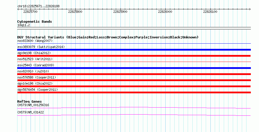 Variant DetailsVariant: dgv10e198| Internal ID | 22757742 | | Landmark | | | Location Information | | | Cytoband | 18q11.2 | | Allele length | | Assembly | Allele length | | hg38 | 518 | | hg19 | 518 | | hg18 | 518 |