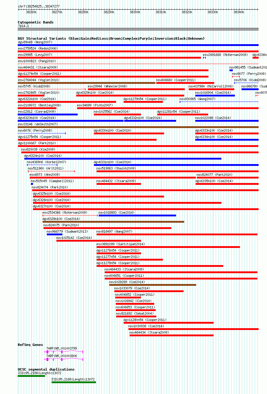 Variant DetailsVariant: dgv1100n67 | Internal ID | 20147612 | | Landmark | | | Location Information | | | Cytoband | 7p14.1 | | Allele length | | Assembly | Allele length | | hg38 | 92453 | | hg19 | 92453 | | hg18 | 92453 |