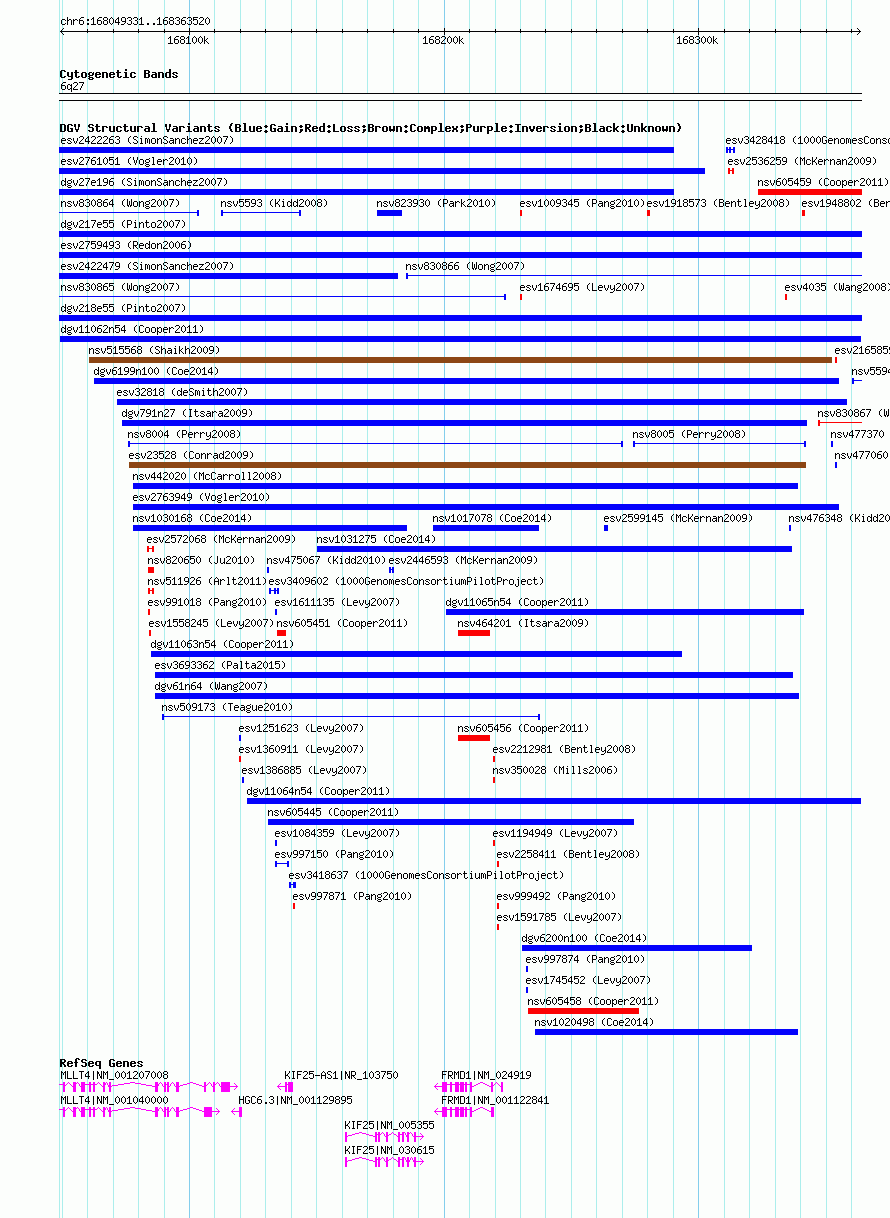 | | Variant Type | CNV gain | | Copy Number | | | Allele State | | | Allele Origin | | | Probe Count | | | Validation Flag | | | Merged Status | M | | Merged Variants | | | Supporting Variants | nsv605372, nsv605369, nsv605430, nsv605412, nsv605410, nsv605429, nsv605390, nsv605395, nsv605415, nsv605413, nsv605368, nsv605381, nsv605434, nsv605367, nsv605419, nsv605392, nsv605408, nsv605382, nsv605384, nsv605417, nsv605431, nsv605380, nsv605375, nsv605370, nsv605411, nsv605404, nsv605385, nsv605424, nsv605379, nsv605416, nsv605406, nsv605373, nsv605371, nsv605374, nsv605383, nsv605386, nsv605377, nsv605437, nsv605388, nsv605439, nsv605428, nsv605376, nsv605407, nsv605387, nsv605401, nsv605422, nsv605435, nsv605391, nsv605418, nsv605433, nsv605421, nsv605420, nsv605436, nsv605378, nsv605427, nsv605394, nsv605425, nsv605402, nsv605403, nsv605432, nsv605414, nsv605423, nsv605440, nsv605438, nsv605389, nsv605426, nsv605405 | | Samples | HGDP00644, 1780854556_A, 1780854231_A, NINDS_103, 1782681236_A, 1780854318_A, NINDS_195, 1780862246_A, 1780854326_A, 1798860592_A, 1780854417_A, 1787431198_A, 1780862419_A, 1780854444_A, NINDS_256, 1780862557_A, NINDS_218, HGDP01373, NINDS_184, NINDS_33, 1780862334_A, 1780854486_A, 1780862587_A, HGDP00669, 1780854393_A, 1780846005_A | | Known Genes | FRMD1, HGC6.3, KIF25, KIF25-AS1, MLLT4 | | Method | SNP array | | Analysis | Illumina SNP array copy number analysis | | Platform | Not reported | | Comments | | | Reference | Cooper_et_al_2011 | | Pubmed ID | 21841781 | | Accession Number(s) | dgv11062n54