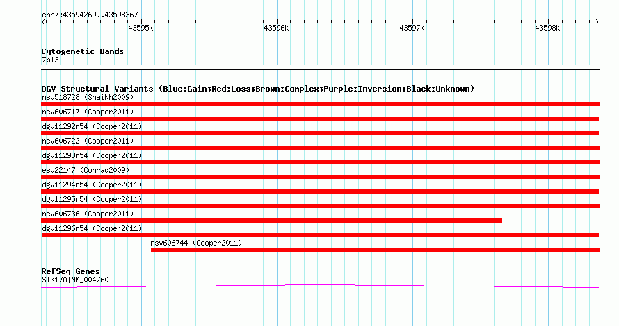 Variant DetailsVariant: dgv11296n54| Internal ID | 22779191 | | Landmark | | | Location Information | | | Cytoband | 7p13 | | Allele length | | Assembly | Allele length | | hg38 | 4099 | | hg19 | 4099 | | hg18 | 4099 |