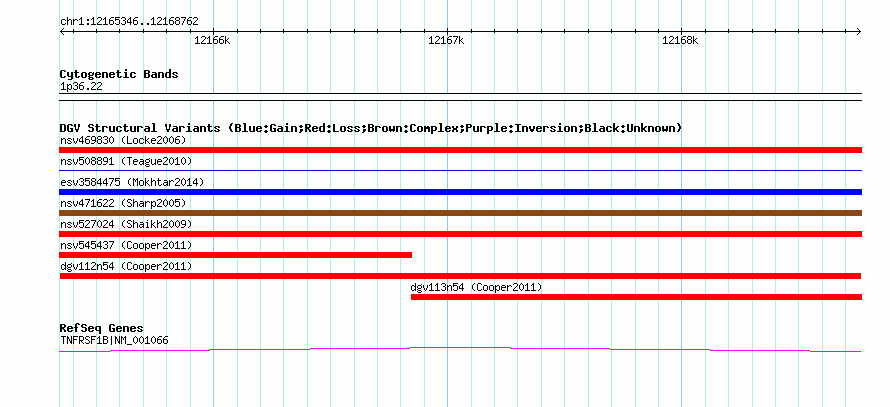 Variant DetailsVariant: dgv112n54| Internal ID | 20133536 | | Landmark | | | Location Information | | | Cytoband | 1p36.22 | | Allele length | | Assembly | Allele length | | hg38 | 3417 | | hg19 | 3417 | | hg18 | 3417 |