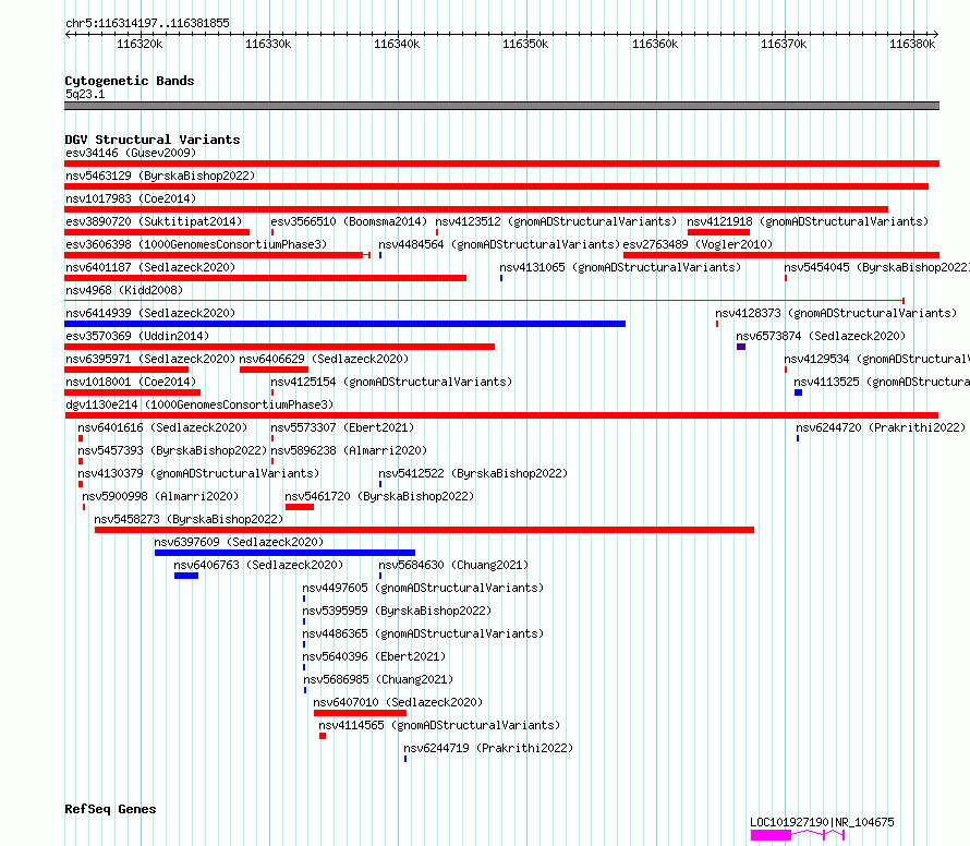 Variant DetailsVariant: dgv1130e214| Internal ID | 22757024 | | Landmark | | | Location Information | | | Cytoband | 5q23.1 | | Allele length | | Assembly | Allele length | | hg38 | 67659 | | hg19 | 67659 |
