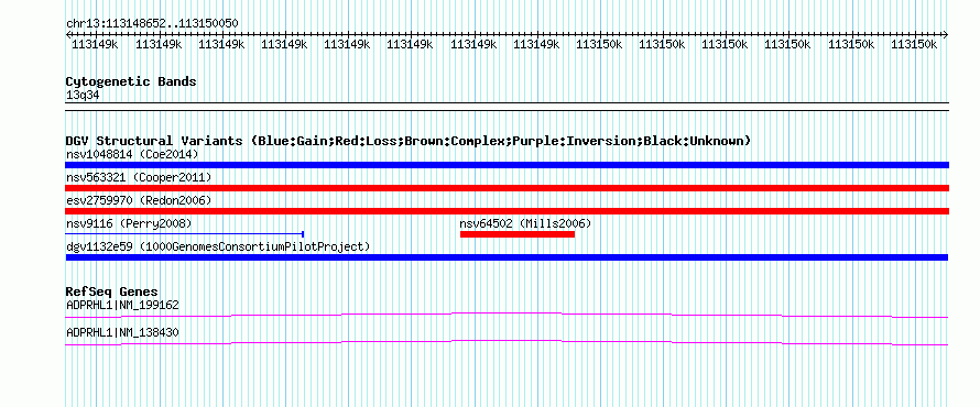 Variant DetailsVariant: dgv1132e59| Internal ID | 22762352 | | Landmark | | | Location Information | | | Cytoband | 13q34 | | Allele length | | Assembly | Allele length | | hg38 | 1399 | | hg19 | 1399 | | hg18 | 1399 |