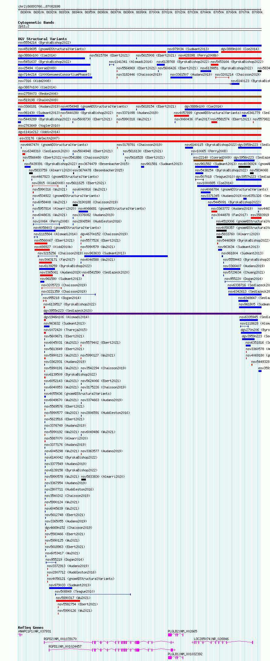 Variant DetailsVariant: dgv1141e212| Internal ID | 22784068 | | Landmark | | | Location Information | | | Cytoband | 2p11.2 | | Allele length | | Assembly | Allele length | | hg38 | 188933 | | hg19 | 188933 |
