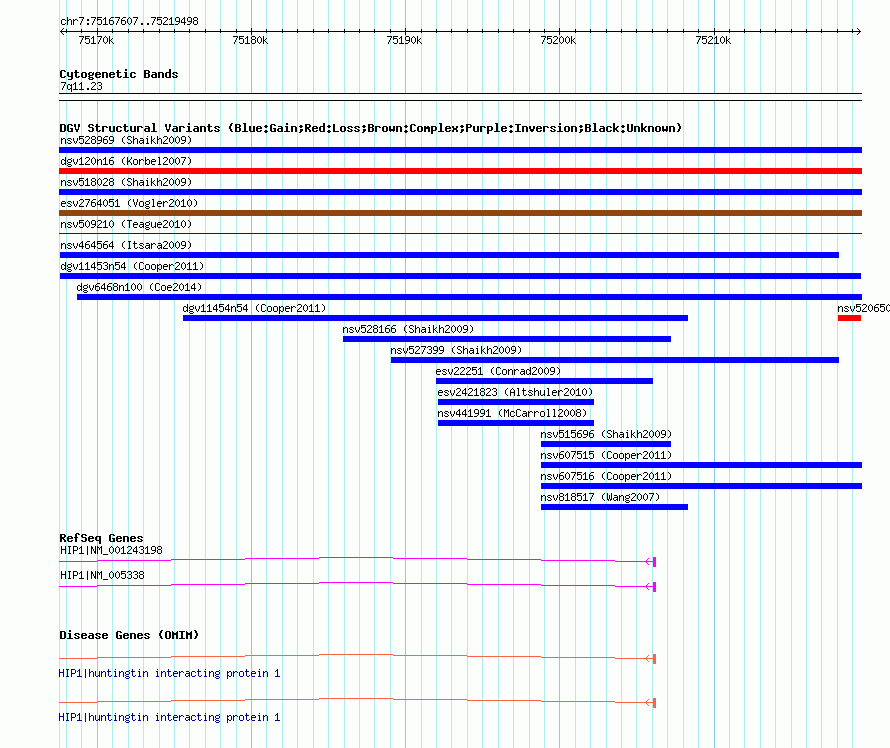 | | Variant Type | CNV gain | | Copy Number | | | Allele State | | | Allele Origin | | | Probe Count | | | Validation Flag | | | Merged Status | M | | Merged Variants | | | Supporting Variants | nsv607511, nsv607513 | | Samples | NINDS_147 | | Known Genes | HIP1 | | Method | SNP array | | Analysis | Illumina SNP array copy number analysis | | Platform | Not reported | | Comments | | | Reference | Cooper_et_al_2011 | | Pubmed ID | 21841781 | | Accession Number(s) | dgv11453n54