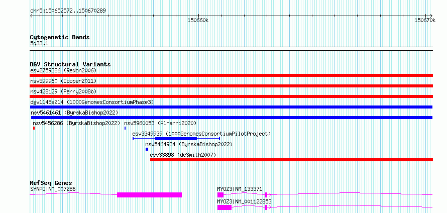 Variant DetailsVariant: dgv1148e214| Internal ID | 22757042 | | Landmark | | | Location Information | | | Cytoband | 5q33.1 | | Allele length | | Assembly | Allele length | | hg38 | 17718 | | hg19 | 17718 |