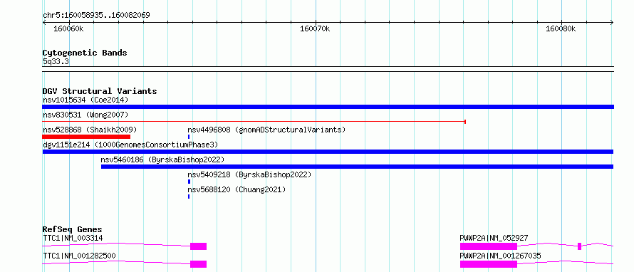 Variant DetailsVariant: dgv1151e214| Internal ID | 22757045 | | Landmark | | | Location Information | | | Cytoband | 5q33.3 | | Allele length | | Assembly | Allele length | | hg38 | 23135 | | hg19 | 23135 |