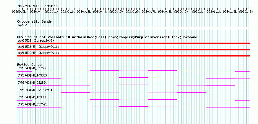 | | Variant Type | CNV loss | | Copy Number | | | Allele State | | | Allele Origin | | | Probe Count | | | Validation Flag | | | Merged Status | M | | Merged Variants | | | Supporting Variants | nsv607929, nsv607928 | | Samples | | | Known Genes | CYP3A43 | | Method | SNP array | | Analysis | Illumina SNP array copy number analysis | | Platform | Not reported | | Comments | | | Reference | Cooper_et_al_2011 | | Pubmed ID | 21841781 | | Accession Number(s) | dgv11527n54