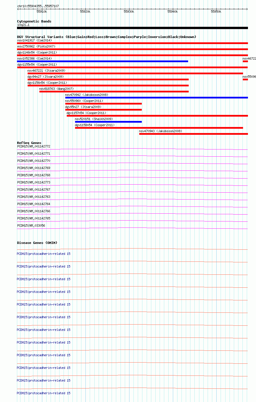 Variant DetailsVariant: dgv1155n54| Internal ID | 20134579 | | Landmark | | | Location Information | | | Cytoband | 10q21.1 | | Allele length | | Assembly | Allele length | | hg38 | 52753 | | hg19 | 52753 | | hg18 | 52753 |