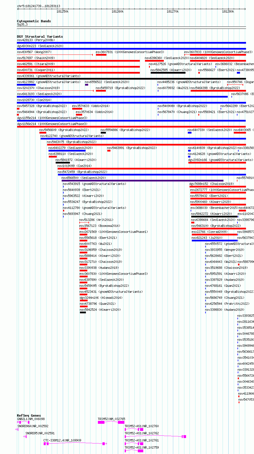 | | Variant Type | CNV loss | | Copy Number | | | Allele State | | | Allele Origin | | | Probe Count | | | Validation Flag | | | Merged Status | M | | Merged Variants | | | Supporting Variants | esv3607826, esv3607828 | | Samples | HG01678 | | Known Genes | GNB2L1, SNORD95, SNORD96A, TRIM52, TRIM52-AS1 | | Method | Sequencing | | Analysis | | | Platform | Multiple platforms | | Comments | | | Reference | 1000_Genomes_Consortium_Phase_3 | | Pubmed ID | 21293372 | | Accession Number(s) | dgv1156e214