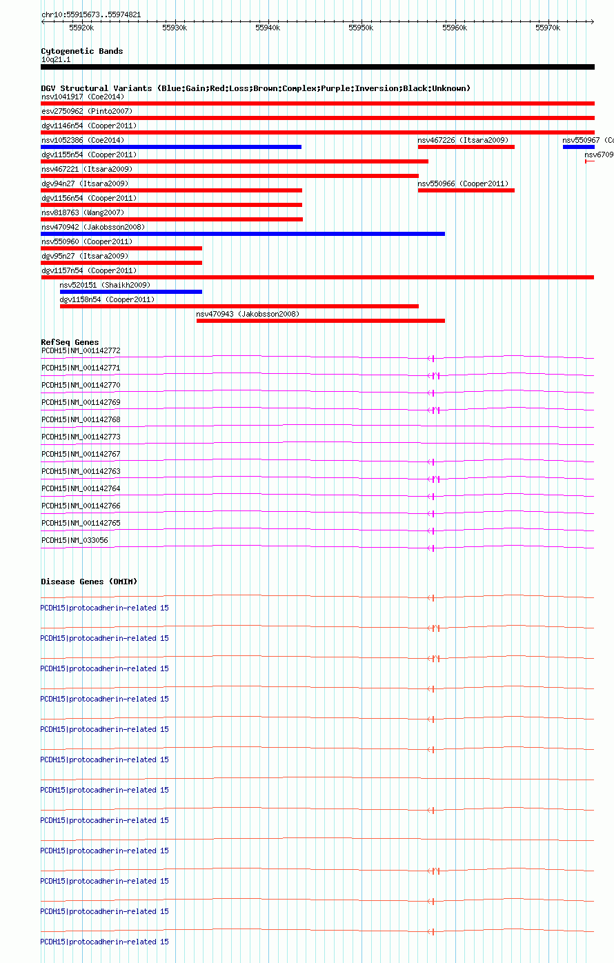 Variant DetailsVariant: dgv1157n54| Internal ID | 20134581 | | Landmark | | | Location Information | | | Cytoband | 10q21.1 | | Allele length | | Assembly | Allele length | | hg38 | 59149 | | hg19 | 59149 | | hg18 | 59149 |