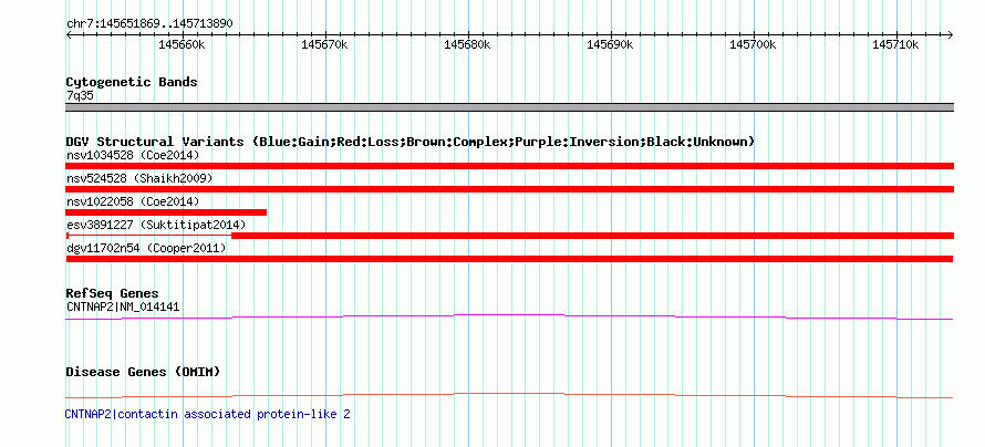 | | Variant Type | CNV loss | | Copy Number | | | Allele State | | | Allele Origin | | | Probe Count | | | Validation Flag | | | Merged Status | M | | Merged Variants | | | Supporting Variants | nsv608929, nsv608930 | | Samples | | | Known Genes | CNTNAP2 | | Method | SNP array | | Analysis | Illumina SNP array copy number analysis | | Platform | Not reported | | Comments | | | Reference | Cooper_et_al_2011 | | Pubmed ID | 21841781 | | Accession Number(s) | dgv11702n54