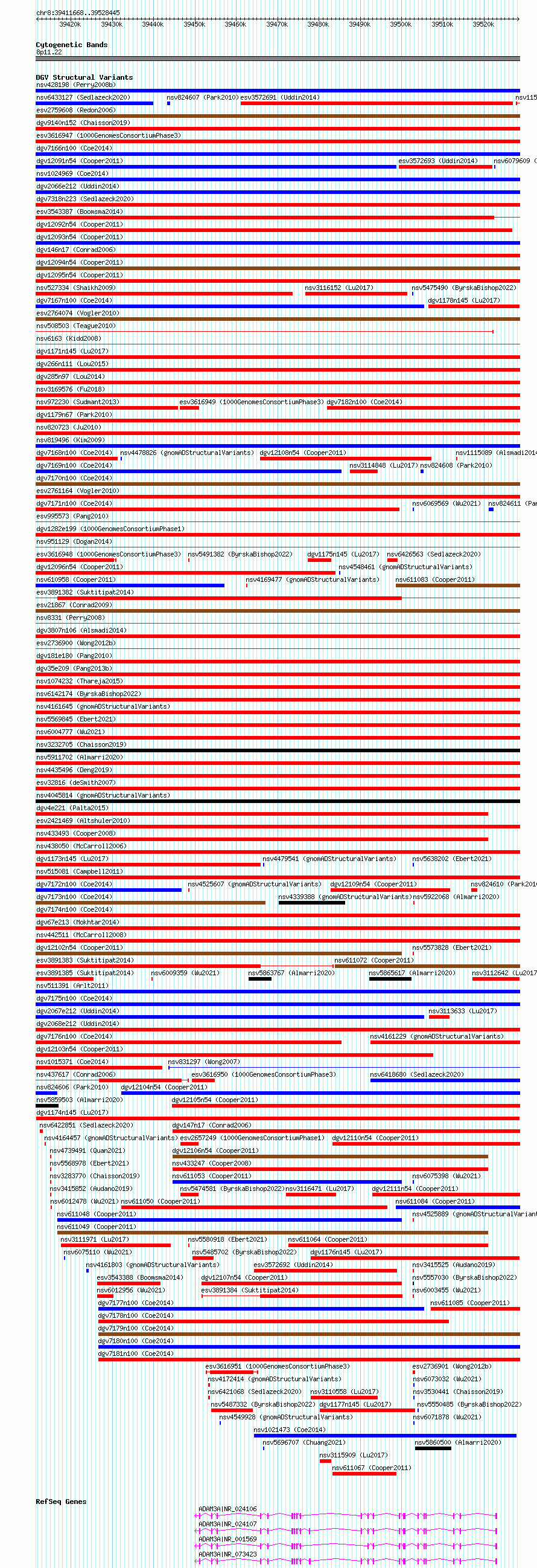 Variant DetailsVariant: dgv1174n145| Internal ID | 22814190 | | Landmark | | | Location Information | | | Cytoband | 8p11.22 | | Allele length | | Assembly | Allele length | | hg38 | 116778 | | hg19 | 116778 |