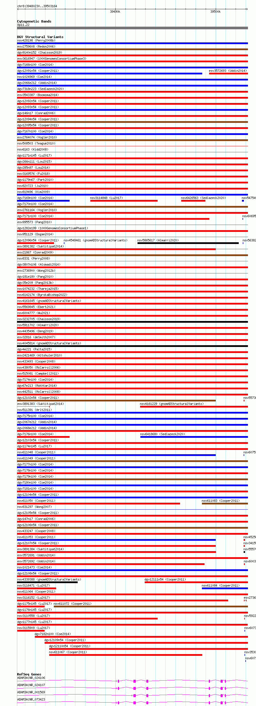 Variant DetailsVariant: dgv1177n145| Internal ID | 22814193 | | Landmark | | | Location Information | | | Cytoband | 8p11.22 | | Allele length | | Assembly | Allele length | | hg38 | 22935 | | hg19 | 22935 |