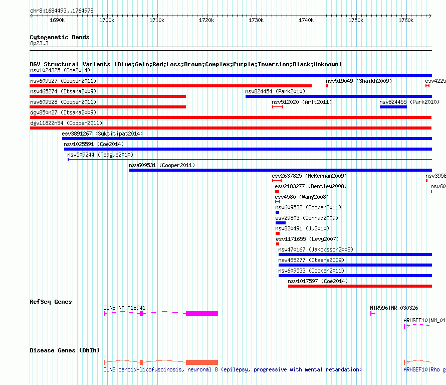 Variant DetailsVariant: dgv11822n54| Internal ID | 22779717 | | Landmark | | | Location Information | | | Cytoband | 8p23.3 | | Allele length | | Assembly | Allele length | | hg38 | 80486 | | hg19 | 80486 | | hg18 | 80486 |